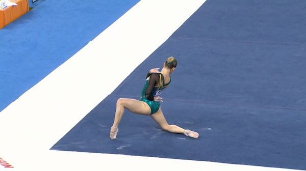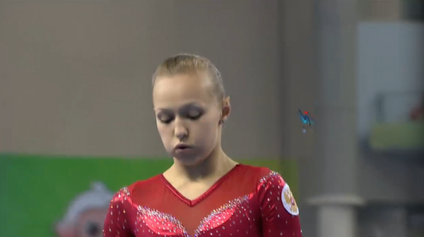 Daria Spiridonova had an absolutely beautiful routine. She performed an inbar, inbar full, and Komova II to pak salto to start, had a lovely van Leeuwen, and then hit an inbar half to big piked Jaeger before landing her full-in dismount. Just gorgeous form, and she earned a 14.966 for her effort.