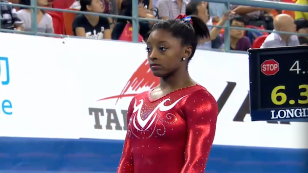Simone Biles competed an Amanar, and it was huge and clean with a hop forward, smaller than the one she had in the qualifications. I honestly think she’s surpassing McKayla Maroney in how clean and powerful she is, and she earned a 15.866 for the team.