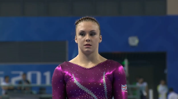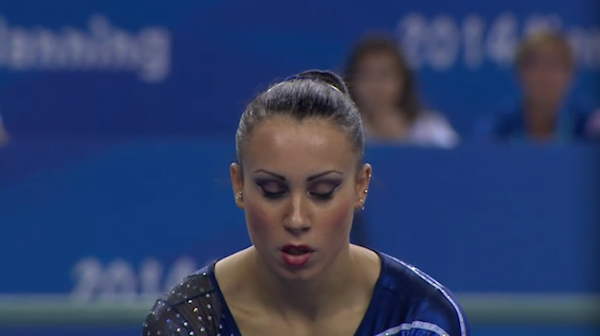 Vanessa Ferrari competed a routine that began with a nice planche mount. Her bhs-bhs-layout series was hit with a leg up, and her front aerial-wolf-sissone series was nice as well. She had a strong switch ring and hit her double pike dismount with no problems. 14.3