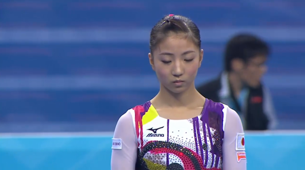 Asuka Teramoto began her routine with a nicely controlled double twist. She hit her Onodi to jump series, but then unfortunately fell on her bhs-bhs-layout series, which she landed a bit off-line. Her front aerial to side somi was slowly connected, and she hit her triple full dismount.