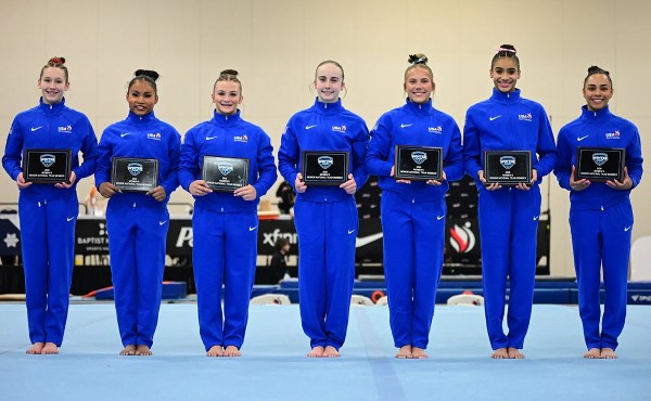 Greta Krob, Simone Rose, Caroline Moreau, Claire Pease, Reese Esponda, Charleigh Bullock, and Hezly Rivera (photo courtesy of USA Gymnastics)