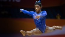 Simone Biles, 21, will make history as the first gymnast to win four world all-around titles if she wins the gold with tonight’s performance in Doha.